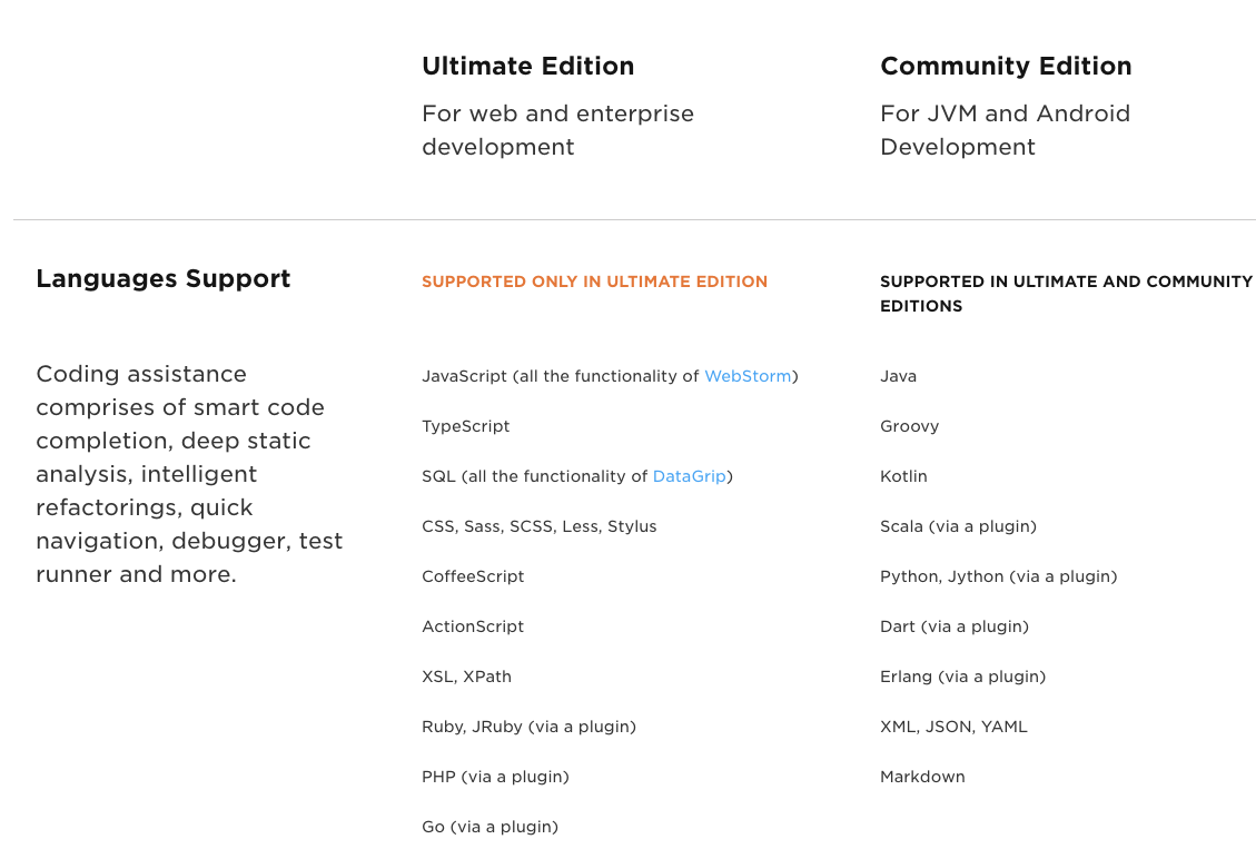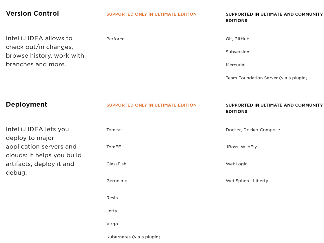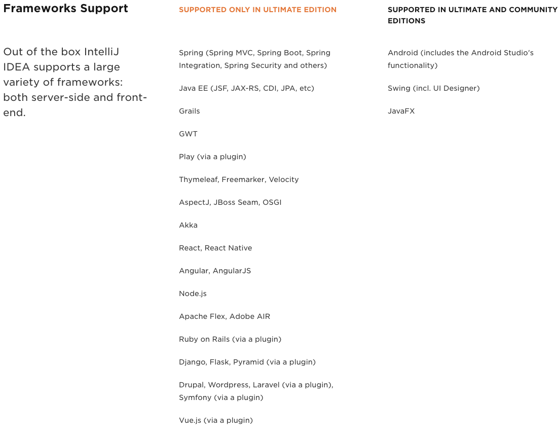 IntelliJ 공홈에 나와있는 IDEA Ultimate 버전과 Community 버전(무료)의 차이는 다음과 같습니다.